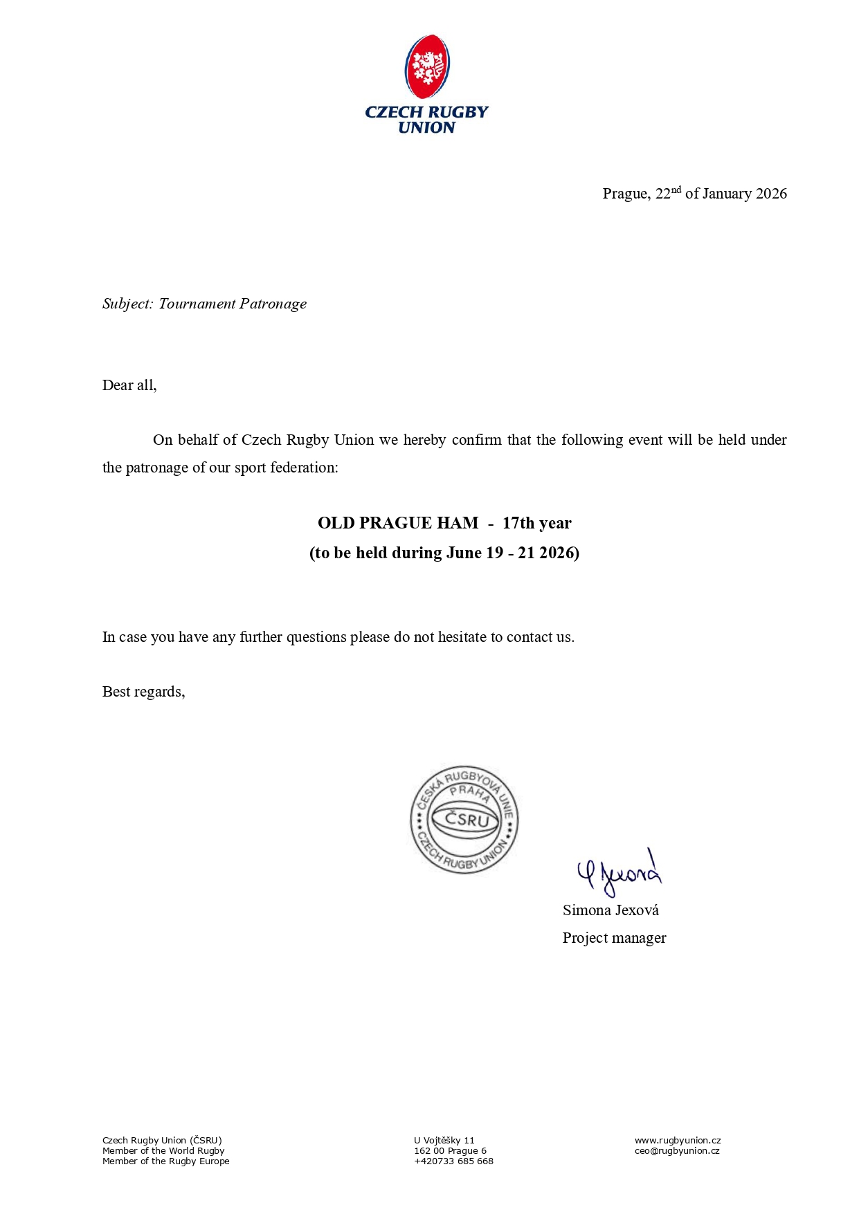Czech Rugby Union patronage